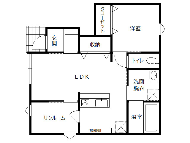 | 詳細間取 | 1LDK (洋4.8帖×1、LDK12帖、サンルーム3帖) | ||